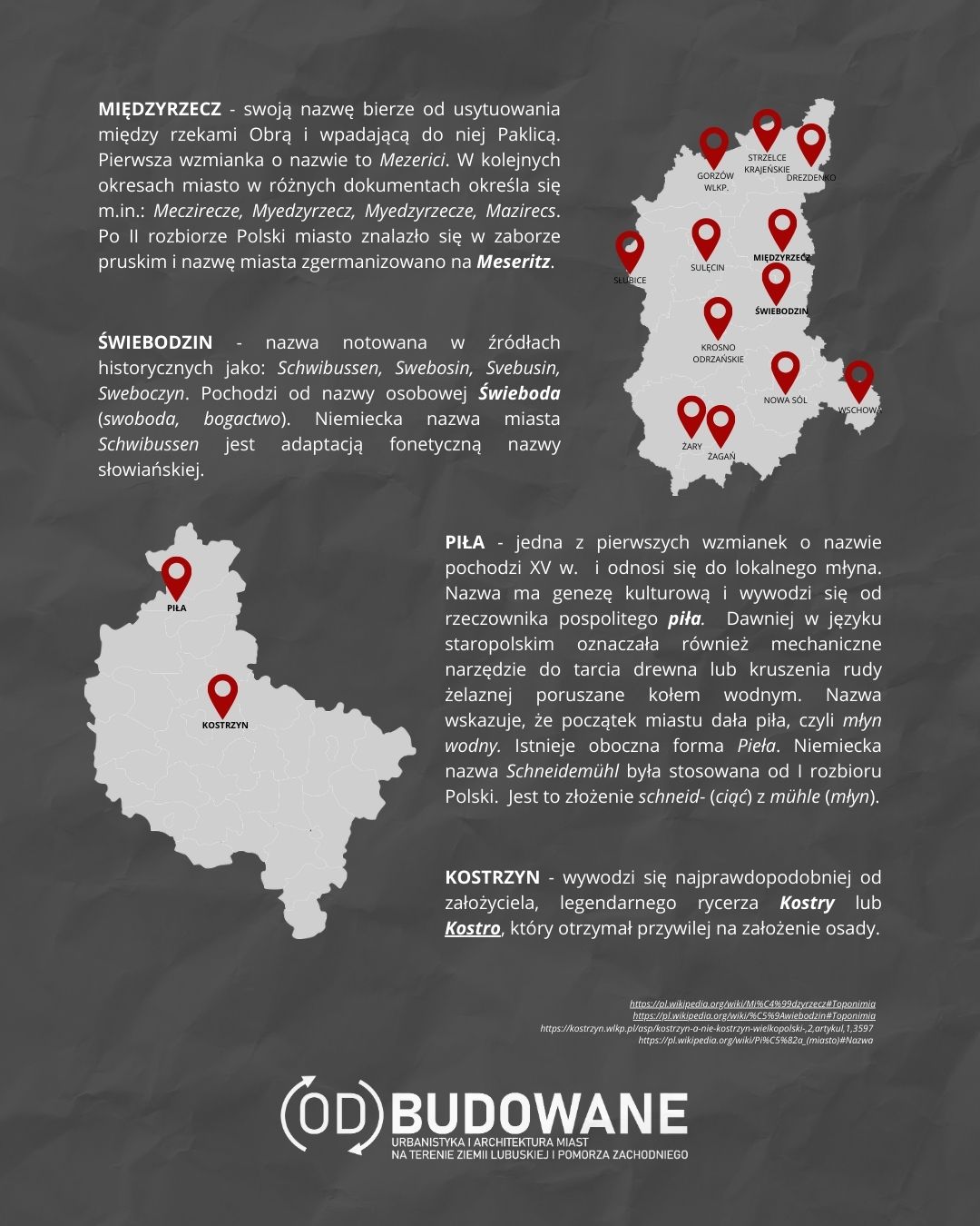 Cześć! Dzisiaj przybliżymy wam kilka miast, które analizujemy, a dokładnie skąd wzięły się ich nazwy? Sama nazwa przynosi już dużo informacji o rejonie i o historii ziem np. w jakich krajach się znajdował? Kto je zamieszkiwał? Z czego słynęło? Czy znajdowało się w pobliżu coś wyjątkowego? Niektóre nazwy nie są tak oczywiste jak mogłoby się wydawać, ponieważ często pochodzą z archaicznego języka lub łączą z sobą kilka elementów. W poście znajdziecie informacje o miejscowościach województw wielkopolskiego i lubuskiego. Obserwujcie nas, bo to nie wszystkie miasta, które badamy w naszym projekcie. Prezentacja następnych miast już niedługo!